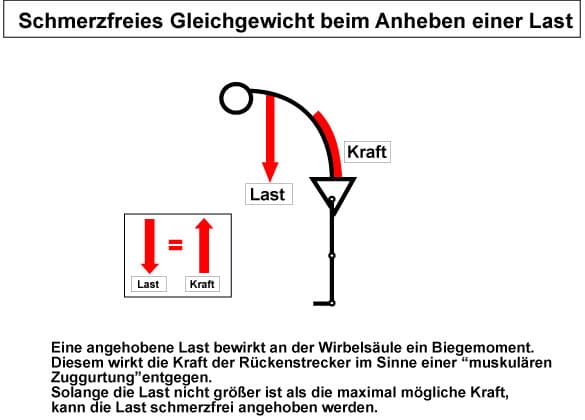 Die gehobene Last – der Kasten – bewirkt ein Biegemoment an der Wirbelsäule. Diesem Biegemoment wirkt die Kraft der Rückenstrecker entgegen. Wir sprechen von einer „muskulären Zuggurtung“. Die Kraft der Rückenstrecker presst die Wirbel gegeneinander. Der BS-Druck steigt. Die Fasern des BS-Ringes werden angespannt und stabilisieren die Wirbel miteinander. Last, Kraft, BS-Druck und Faserspannung stehen im Gleichgewicht. Die WS ist stabil und schmerzfrei.