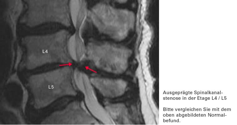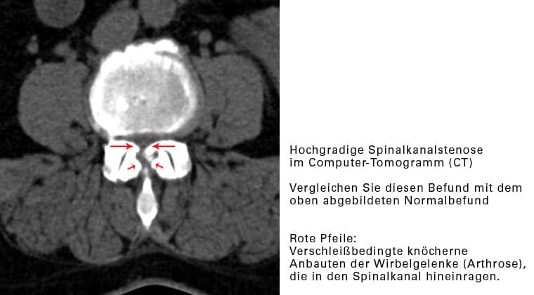Es liegt eine krankhafte Verengung des Wirbelkanales vor (Stenose des Spinalkanales). Diese tritt in der Regel erst in höherem Alter auf. Sie wird verursacht durch: