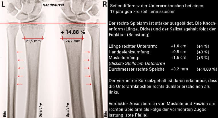 Der rechte Arm wächst mehr in die Länge, die Knochen werden dicker und lagern mehr Calcium ein. Die Muskeln des rechten Armes werden kräftiger. Der linke Arm bleibt in allen Eigenschaften zurück. Beide Arme unterliegen selbstverständlich dem gleichen genetischen Einfluss.