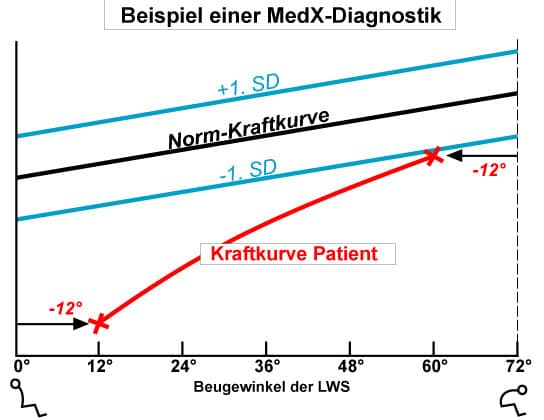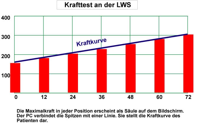 Eine normale, gesunde Kraftkurve ist linear und in der gebeugten Position 1.4-fach stärker als in der Hohlkreuz - Position: sie fällt also linear ab.