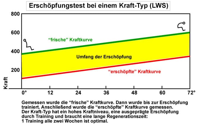 Die höchste jemals in meiner Praxis gemessene Erschöpfung betrug 70 %. Das heißt: die erschöpfte Kraftkurve war 70 % schwächer als die frische. Diese genetischen Besonderheiten müssen bei der Trainingssteuerung berücksichtigt werden.