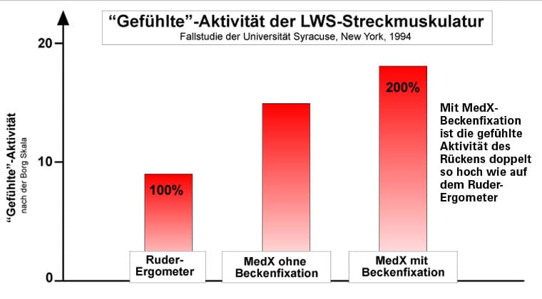 Die elektrische Aktivität der Rückenstrecker kann im EMG gemessen werden (Elektro-Myogramm). Bei der MedX-Beckenfixation ist die EMG-Aktivität der LWS-Streckmuskulatur etwa 5 mal höher als auf dem Ruder-Ergometer. Die "gefühlte" Aktivität der Rückenmuskeln ist doppelt so hoch.