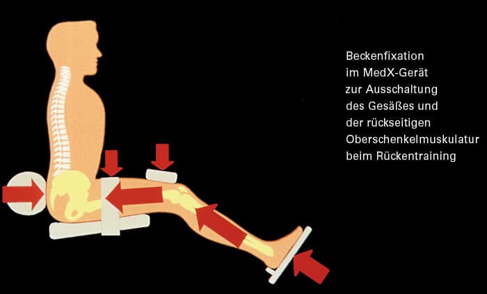 Kraftmessungen der Rumpfaufrichtung sagen deswegen nichts aus über die Kraft der LWS-Muskulatur. Beim Training der Rumpfaufrichtung übernehmen die kräftigen Muskeln des Gesäßes und der rückseitigen Oberschenkelmuskeln die Hauptarbeit. Diese Muskeln schonen also die LWS. Der notwendige Trainingsreiz kommt an der LWS nicht an. Die LWS-Muskeln werden nicht kräftiger. Bei der Diagnostik und dem Training der LWS müssen diese Hilfsmuskeln gerätetechnisch ausgeschaltet werden. Dies gelingt durch die Beckenfixation.