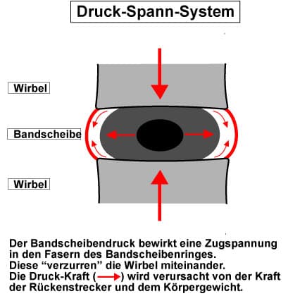 Das Körpergewicht (z.B. im Stehen) und die Kraft der Rückenmuskeln (z.B. beim Heben einer Last) pressen die Wirbel zusammen. Dadurch erhöht sich der Druck in der Bandscheibe. Der weiche BS-Kern (Gallertkern) ist eine zähe, visköse Flüssigkeit. Aus der Physik ist uns allen bekannt, dass eine Flüssigkeit nicht komprimierbar ist. Was tut also der Gallertkern, wenn er unter Druck gerät? Er überträgt den Druck auf die Fasern des Bandscheibenringes. Diese entwickeln eine Zugspannung zwischen den Wirbelkörpern.