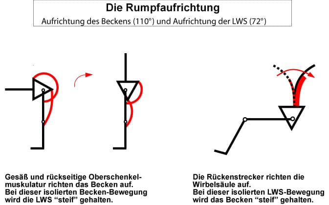 Auch dieser Zusammenhang ist einfach zu verstehen. Stellen Sie sich folgendes vor: Sie stehen mit gestreckten Knien und beugen sich vor, bis Ihre Fingerspitzen den Boden berühren. Dann richten Sie sich auf und beugen den Oberkörper so weit zurück wie Sie können. Dabei bildet Ihre Lendenwirbelsäule eine maximal mögliche Lordose (Hohlkreuz). Sie haben eine komplette Rumpfaufrichtung ausgeführt. Dabei ist Ihnen wahrscheinlich nicht bewußt, dass Sie zwei verschiedene Bewegungen ausgeführt haben: