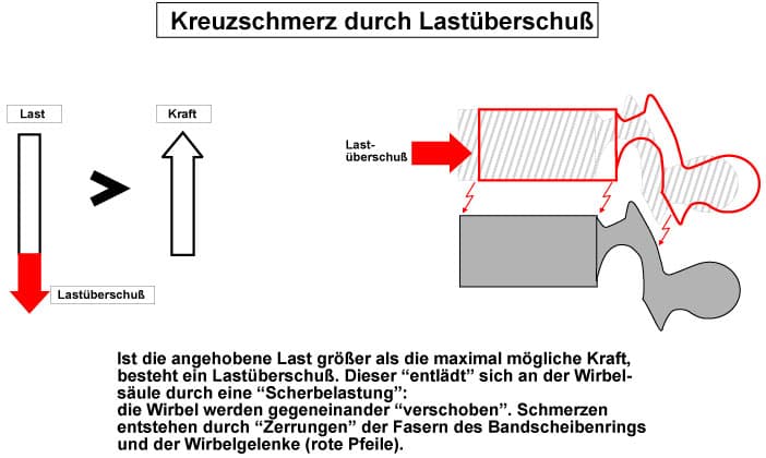 Jede Belastung, welche die stabilisierende Kraft der Rückenstrecker überfordert, führt zu einer Verschiebung der Wirbel gegeneinander.