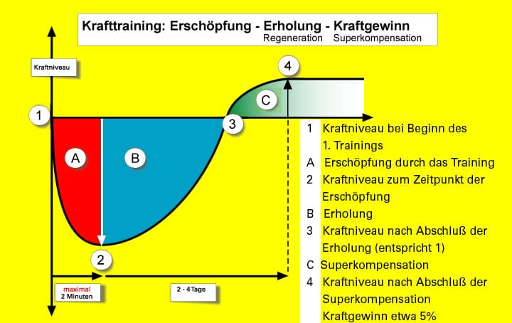 - Am Ende der Erholungsphase befindet sich das Kraftvniveau am Punkt 3. Er hat ein Kraftniveau wie vor Beginn des Trainings. Zu diesem Zeitpunkt hat das Training Ihrem Biceps noch gar nichts genutzt. Er hat zwar den Ablauf von Stoffwechselprozessen trainiert, er hat Energie verbraucht, was Ihnen beim Fettabbau hilft, aber er hat seine Kraft noch nicht verbessert.