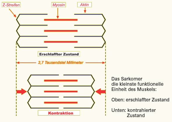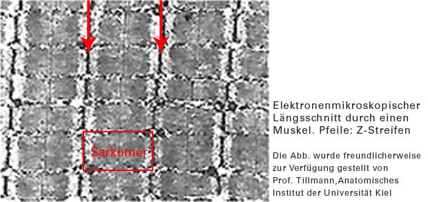 Die kleinste aktive Einheit eines Muskels ist das Sarkomer. Es ist mikroskopisch klein und wird von zwei bindegewebigen Platten begrenzt, den Z-Streifen. Die nebenstehende Abbildung zeigt eine elektronen-mikroskopische Aufnahme eines Muskels. Ein Sarkomer ist rot umrandet.