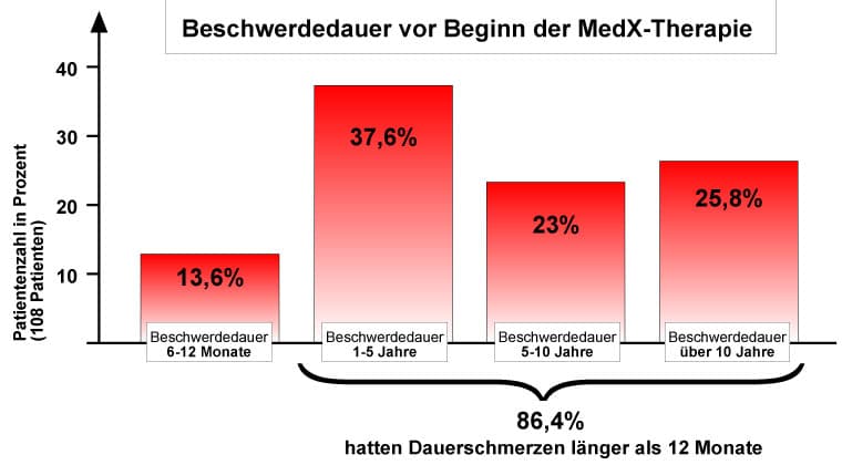 Die Beschwerdedauer vor Beginn der MedX-Therapie war erschreckend: 86,4% der Patienten litten länger als 12 Monate an Dauerschmerzen. Einzelheiten entnehmen Sie bitte nachstehender Abbildung.