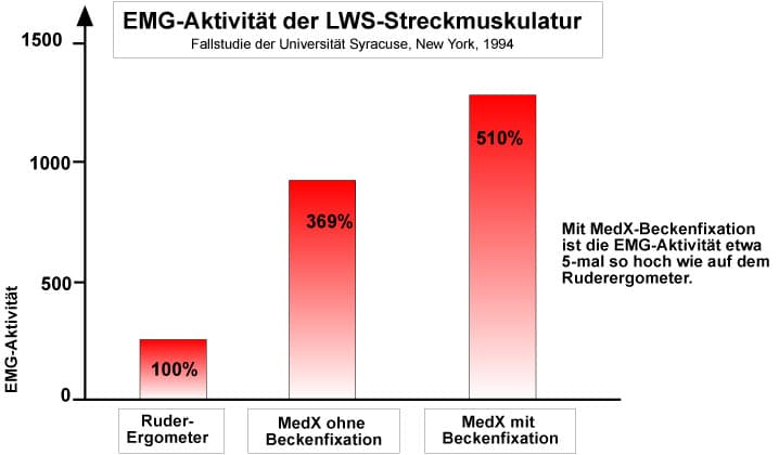 Die elektrische Aktivität der Rückenstrecker kann im EMG gemessen werden (Elektro-Myogramm). Bei der MedX-Beckenfixation ist die EMG-Aktivität der LWS-Streckmuskulatur etwa 5 mal höher als auf dem Ruder-Ergometer. Die "gefühlte" Aktivität der Rückenmuskeln ist doppelt so hoch.